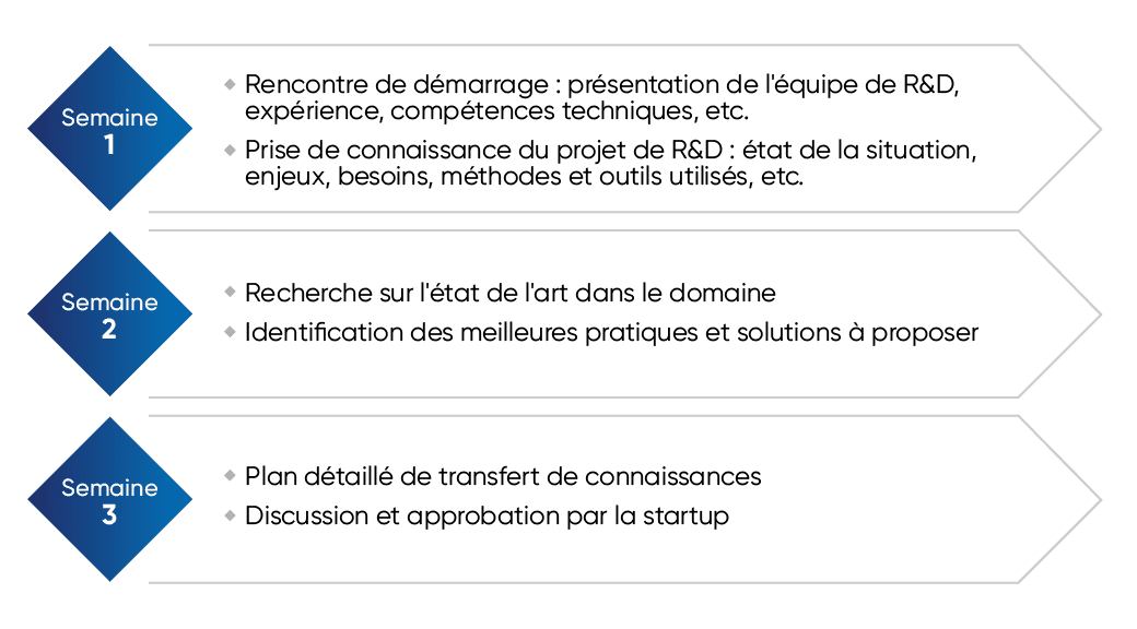Compte tenu que « Scientifique en résidence » est un programme de transmission de connaissances appliquées à un projet de R&D en intelligence artificielle spécifique à chaque startup retenue, l’étape de préparation et de démarrage est essentielle au bon déroulement et à la satisfaction de toutes les parties.