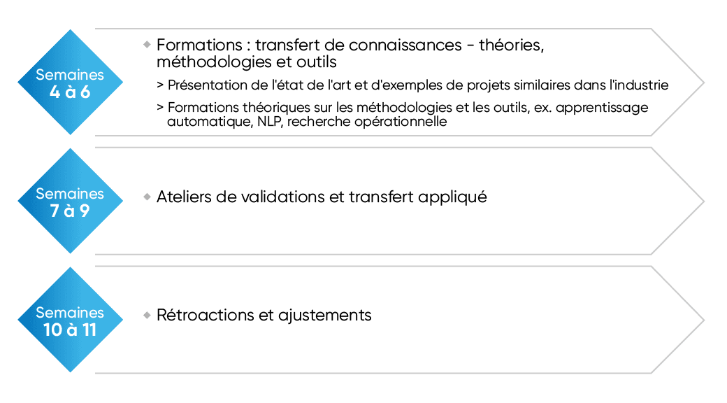 Ce volet est le cœur du programme et, comme son nom l’indique, la période où le transfert de connaissances s’effectuera concrètement. Huit semaines (120h) sont prévues pour ce volet, ce qui permettra de transmettre les connaissances théoriques, méthodologiques et les outils pertinents au projet, de les tester en situation réelle, d’obtenir une rétroaction et d’ajuster au besoin.