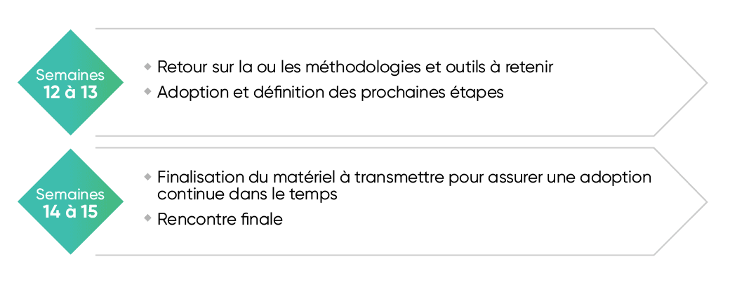 Ce dernier volet consiste à assurer l’adoption des meilleures méthodologies et outils identifiés, et à compléter le transfert de connaissance selon l’avancée du projet de R&D. L’étudiant ou l’étudiante au doctorat accompagnera également la startup dans la définition des prochaines étapes du projet de R&D. Enfin, ce sera le moment de finaliser les documents (état de l’art, formations théoriques et pratiques, plan d’adoption, etc.) dont la startup participante pourra bénéficier à la fin du programme. Quatre semaines (60h) sont réservées à cet effet.