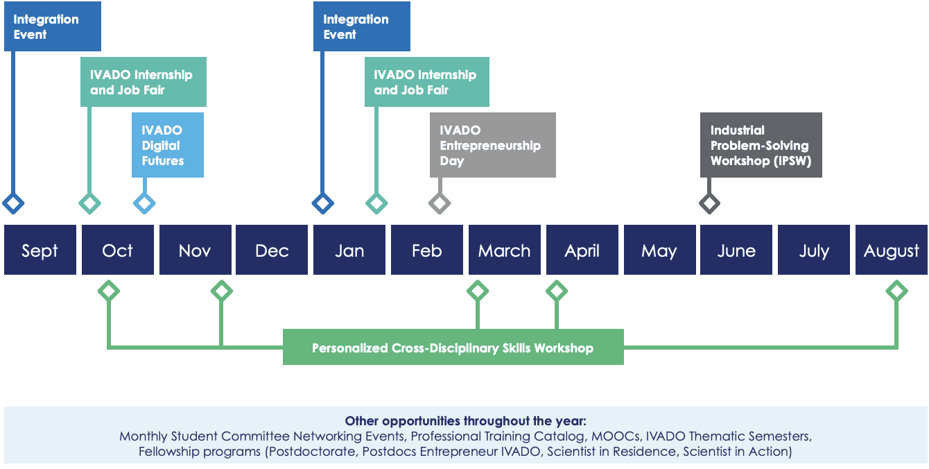 IVADO offers to its student and postdoctoral community a highly diversified calendar of events, including our flagship activities (Internship and Job Fair, Digital Futures, IVADO Entrepreneurship Day, Industrial Problem Solving Workshop), but also, since 2025, customized cross-disciplinary skills workshops, enabling you to apply the theoretical concepts of the workshops specifically to your research projects, while being supervised by specialists in the field.