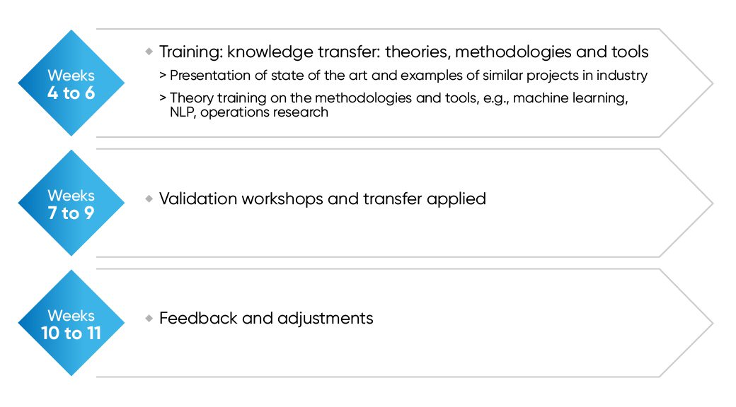 The knowledge transfer plan will cover the 3 components of the program, i.e. preparation and kick-off, training and validation workshops, and transfer. The number of weeks devoted to each stage, as well as the main tasks indicated, may be subject to change depending on the specifics of each project. Following the first stage, a training and transfer plan will be requested.