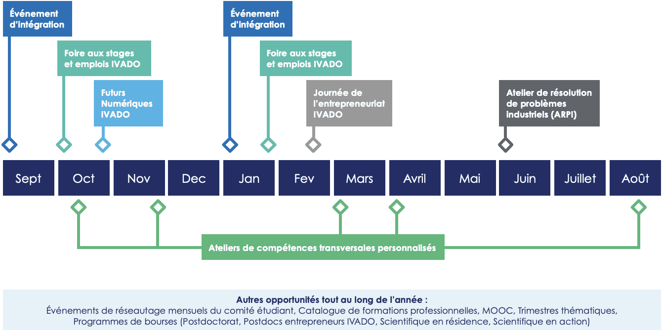 IVADO offre à sa communauté étudiante et postdoctorale un calendrier événementiel très diversifié, incluant nos activités phares (Foire aux stages et emplois, Futurs Numériques, Journée de l’entrepreneuriat IVADO, Atelier de résolution de problèmes industriels), mais aussi, depuis 2025, des ateliers de compétences transversales personnalisés, vous permettant de mettre en application les notions théoriques des ateliers spécifiquement pour vos projets de recherche, tout en étant encadré par des spécialistes dans le domaine.